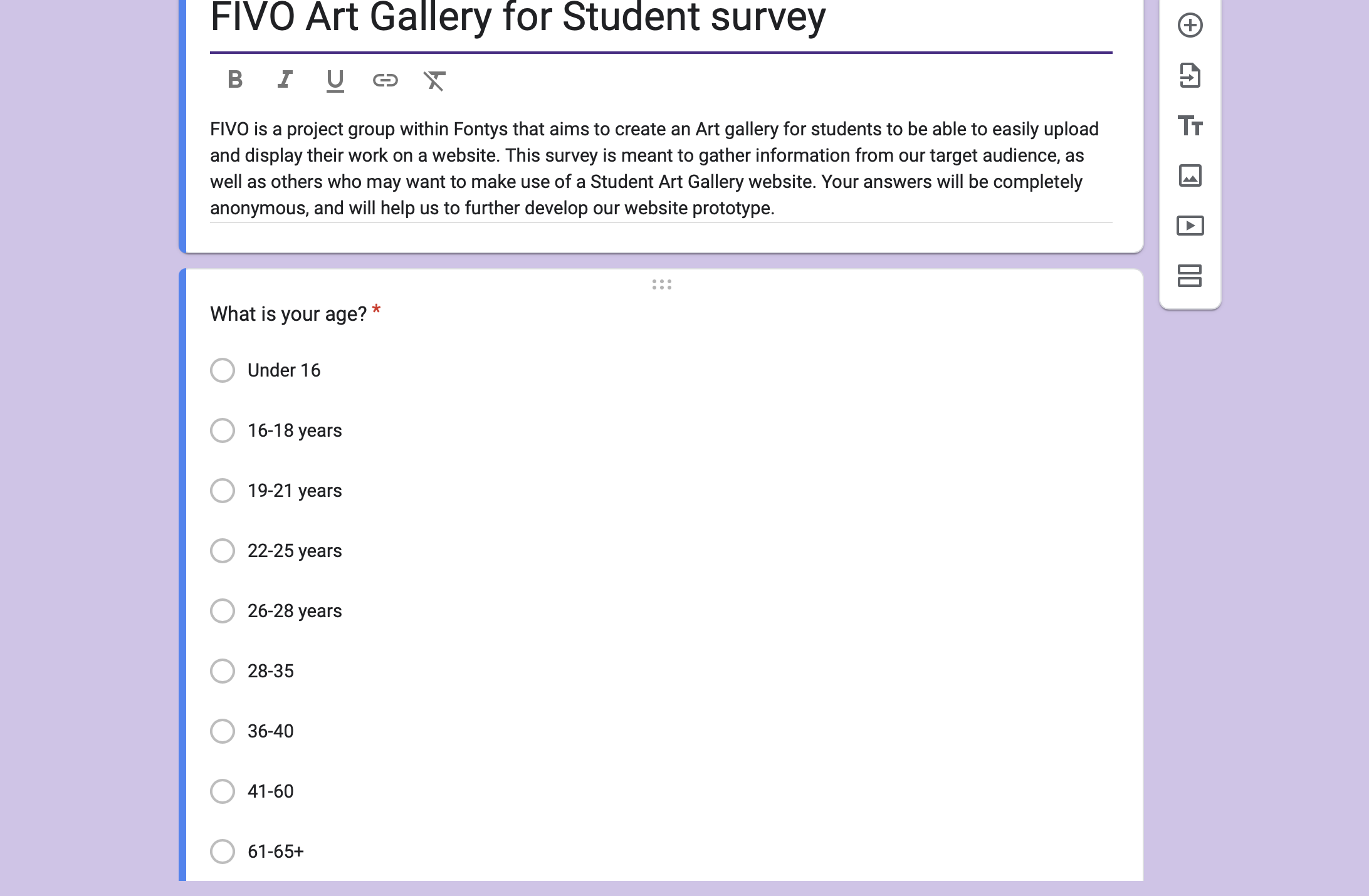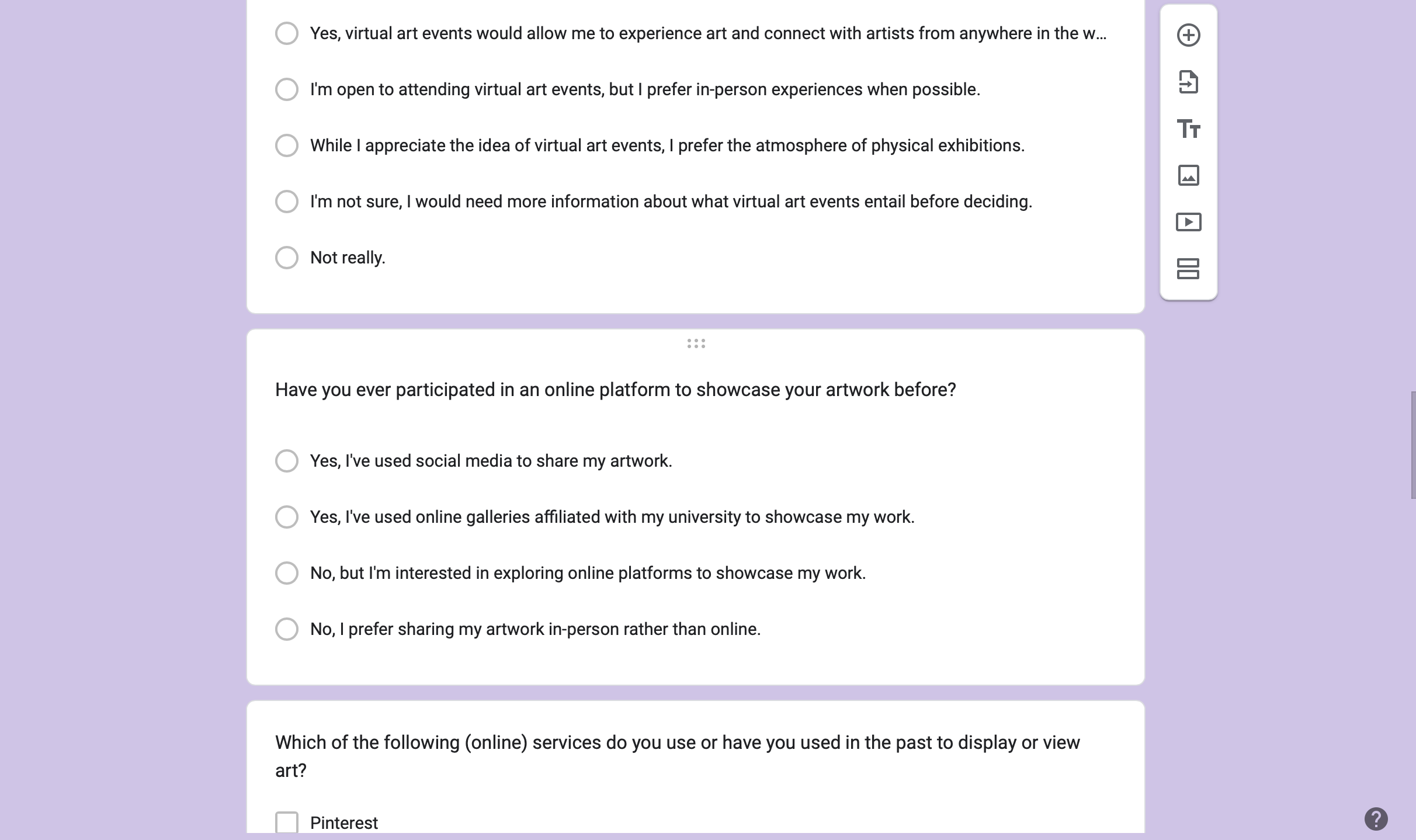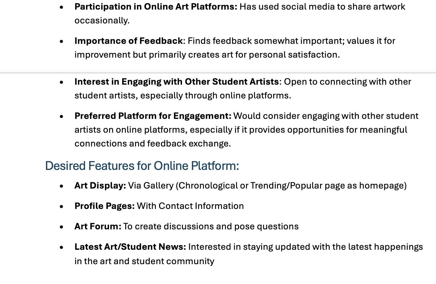 Upon reviewing the feedback, the team noticed that students preferred a virtual art gallery , wanted profile pages and a forums page to be able to communicate with each other. Students also suggested incorporating a comment section so artist can get feedback on their art.