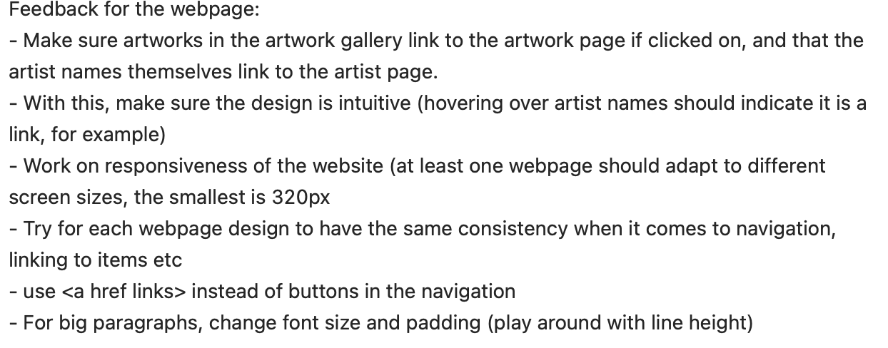 Peer Feedback: Some users mentioned that the project pages felt too empty and lacked sufficient content. Teacher Feedback: suggested using subheadings and bullet points for better readability, adding left and right margins to paragraphs, and maintaining design consistency across all pages. Additionally, they advised caution with using red in the nav bar as it could be perceived as a warning color. They also recommended including before-and-after screenshots to illustrate changes based on feedback.