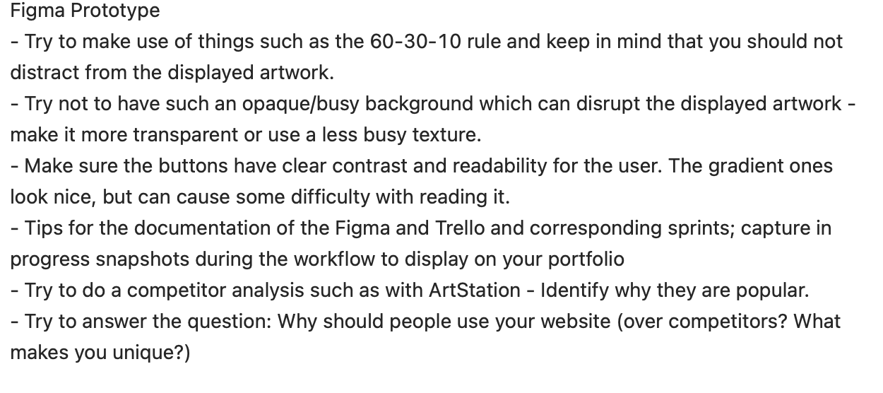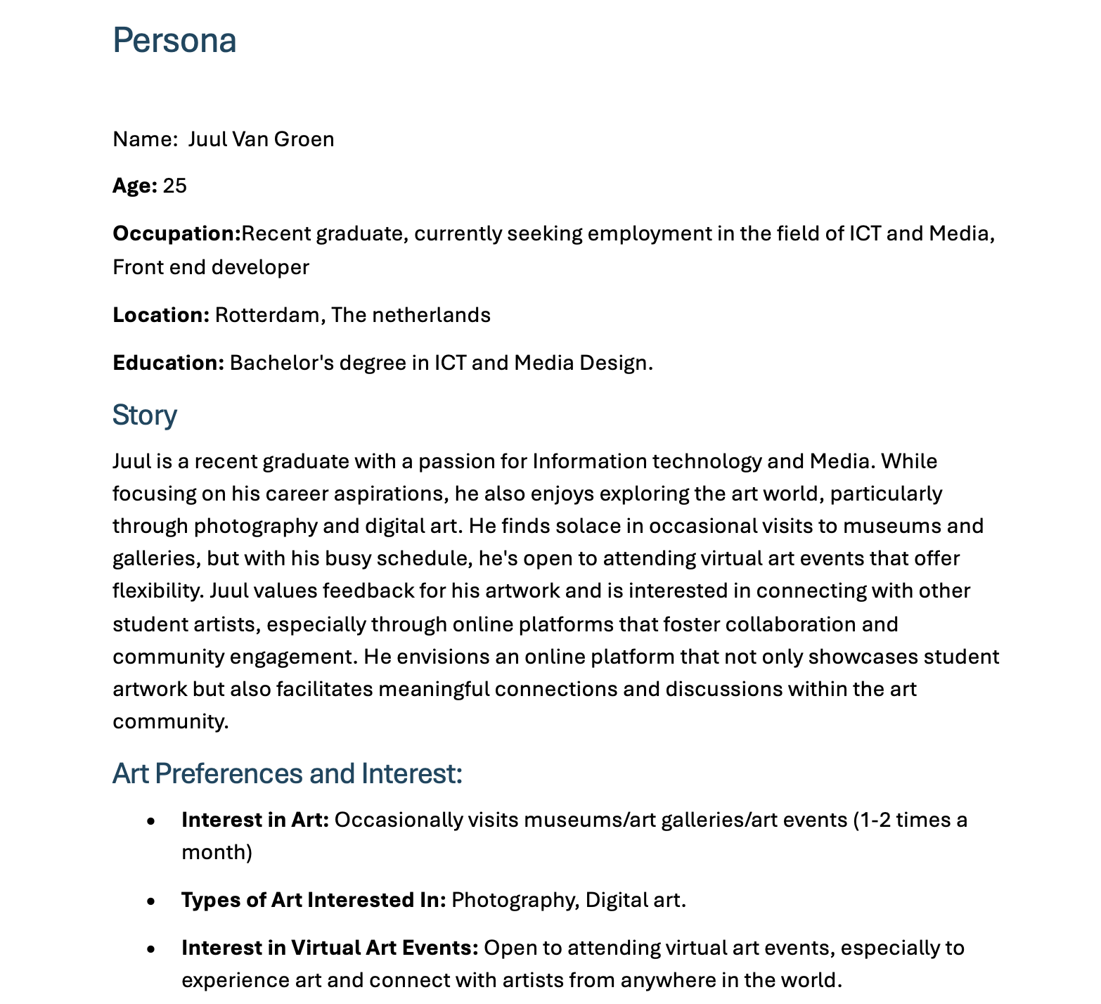 Feedback from peers: they loved the persona so we used this persona to conduct research for our art website. They also like the logos's but I found it myself to be to much happing in one picture. Wirefram was clear and everybody could understand and get the layout of the website.
