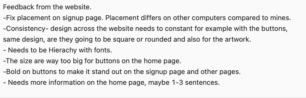 Feedback from my teacher I needed to fix the placement on the signup page as it would show good on my screen but when it was showed on other screens, the pictures would overlap the signin form. The overall signin form position and design was good. Also needed to fix placement issues on the newsletter page as it didnt match the placement on the prototype. Feeback from my group members was that I also neeeded to fix the placement issues on the sign in page as well as they were seeing the same issue as well because of our different screen sizes.